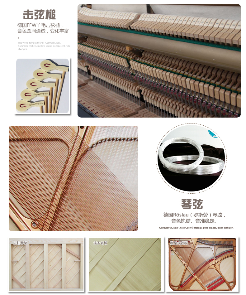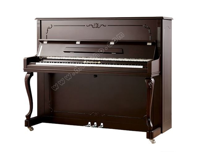 胡桃木色亞光琴身,大搖蓋,單琴耳,小譜架,大弧形彎腿雕有線形花紋,上、下門刻有精致的花枝、花蔓,盡顯浪漫、優雅。
