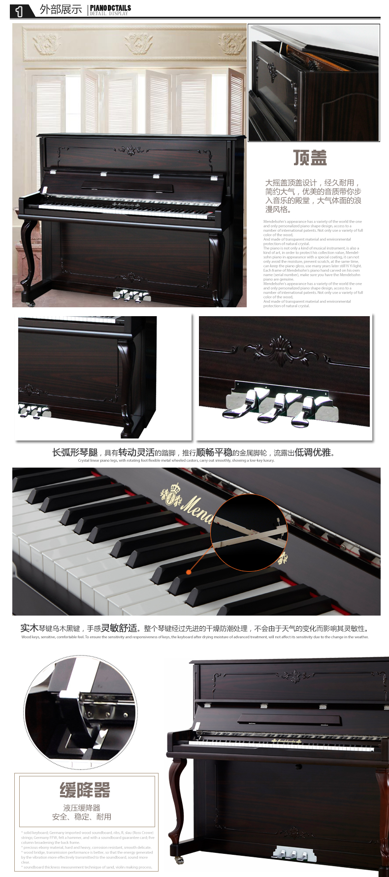 8.鍵盤:歐洲白松實木鍵盤,烏木黑鍵,不易開裂變形,具有很好的觸感