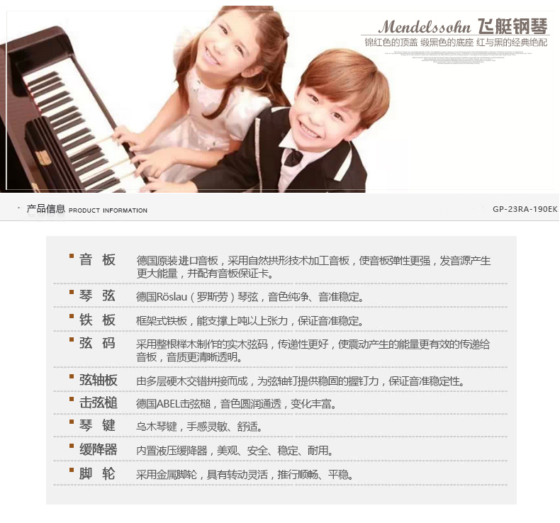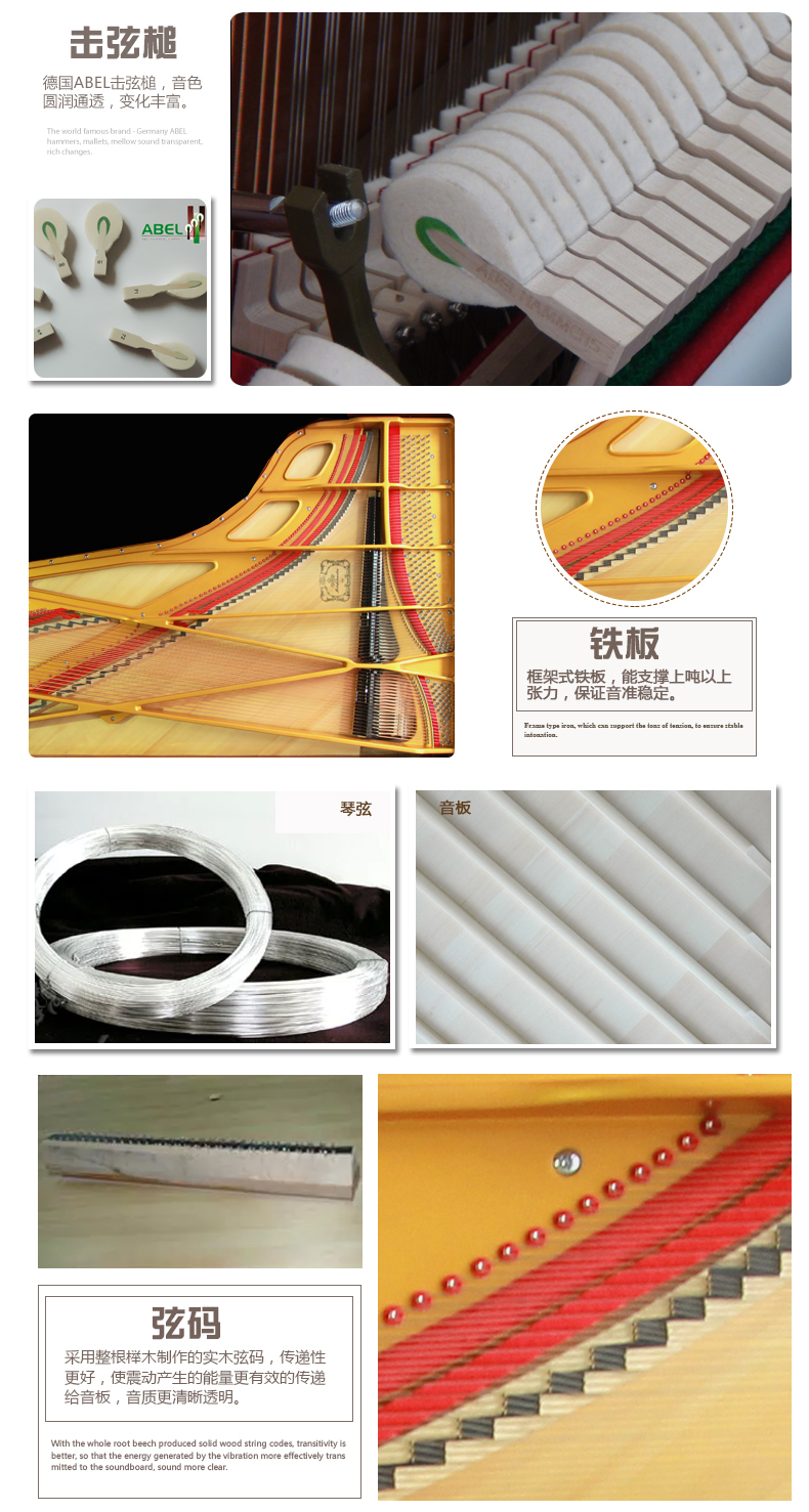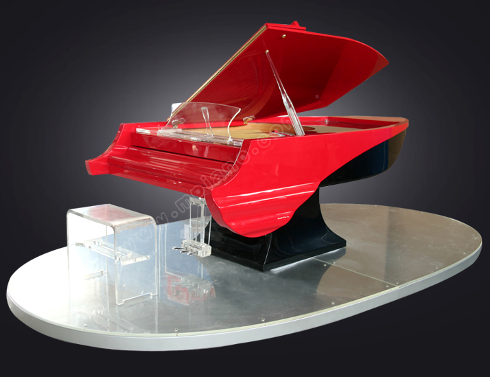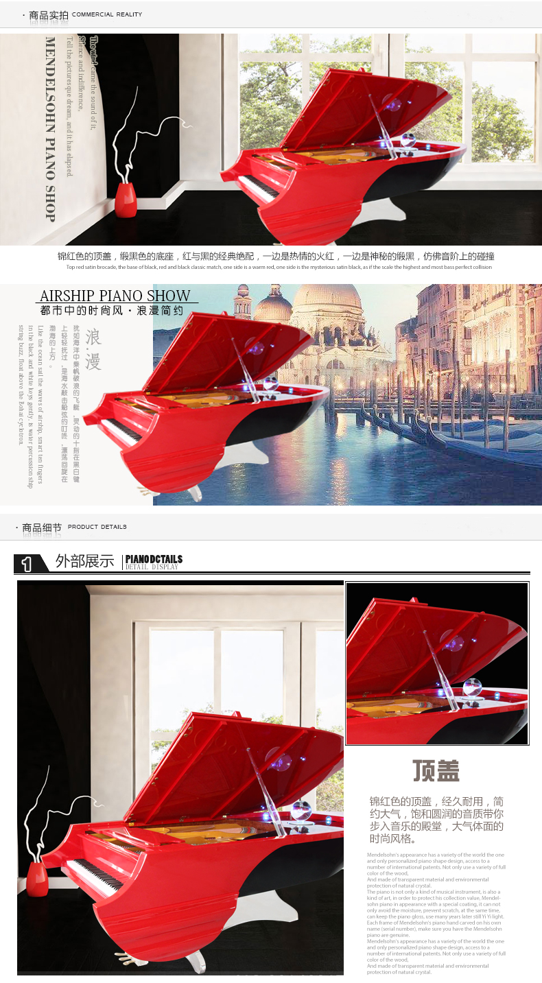 “飛艇”鋼琴的設計理念源于“自由”和“執著”,寓意著人們可以自由徜徉在音樂的海洋,乘風破浪,朝向夢想,勇往直前!當靈動的十指在黑白鍵上輕輕的撫過,仿佛海水在敲擊琴弦,流暢的旋律噴涌而出,靜靜地飄蕩回旋在那藍天碧海之間。 璀璨源于品質,尊貴源于細節,奢華亮麗的飛艇外觀設計,錦紅色的頂蓋、段黑色的底沿,與夢幻般的水晶譜架、踏板和底座相搭配,流暢的整體弧線設計讓整架鋼琴充滿美感。